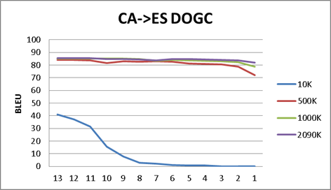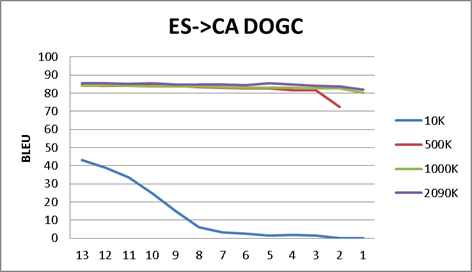 Notice that ES<>PT Europarl results have acceptable BLUE scores (36-39), but ES<>CA DOGC (85-89) excels.