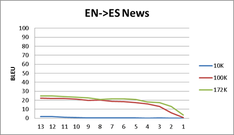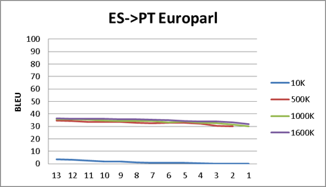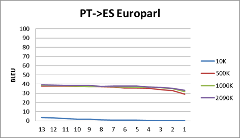 - There is also a very (obvious) interesting result. The EN-ES News corpus probably is too small to raise any conclusion, but, the CA-ES and PT-ES are not minimal. The point here is that CA-ES-PT are very close languages, so, why there this huge difference between ES<>CA and ES<>PT BLEU scores (around 40 points)? Obviously the reason is the corpus. Europarl corpus raises some questions about how is created. For example, we are not sure if the different versions are bridged thru English language. (I.e., maybe a czech speaker is translated to English and from English to all the other languages), or for example, maybe some speeches are not in the speaker mother tongue. Something is preventing the Europarl to reach good scores in a very similar language. On the other hand, we have a reliable corpus (ES<>CA) as the one provided from the local Catalan government. This corpus it should be mainly in CA, and then translated to ES. This corpus is providing us outstanding BLEU scores (near 90). So again, even it is obvious, if you want good results, you need a good corpus.