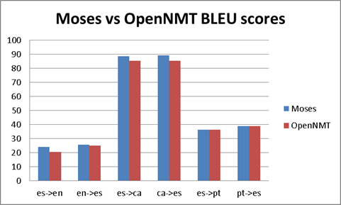 - Moses scores are (a little bit) better than OpenNMT. This is somehow disappointing, but is not new. In the recent OpenMT 2018 workshop in Paris, Tony O'Dowd (KantanMT), also shared with us similar results. The point here is that, or BLEU score is not a good ratio for quality comparison, or OpenNTM is not much better than Moses.